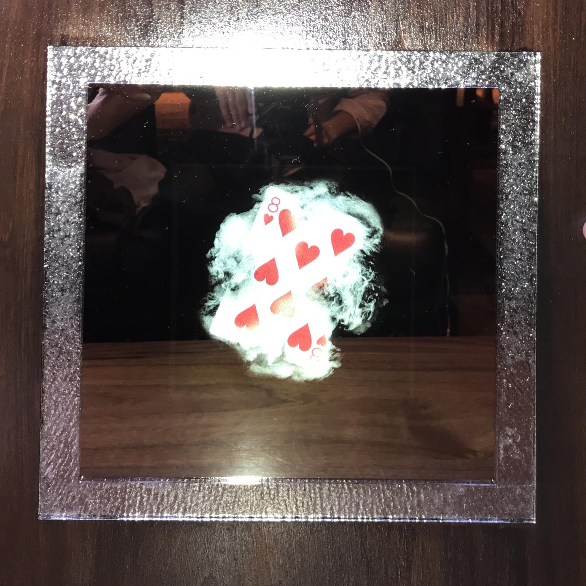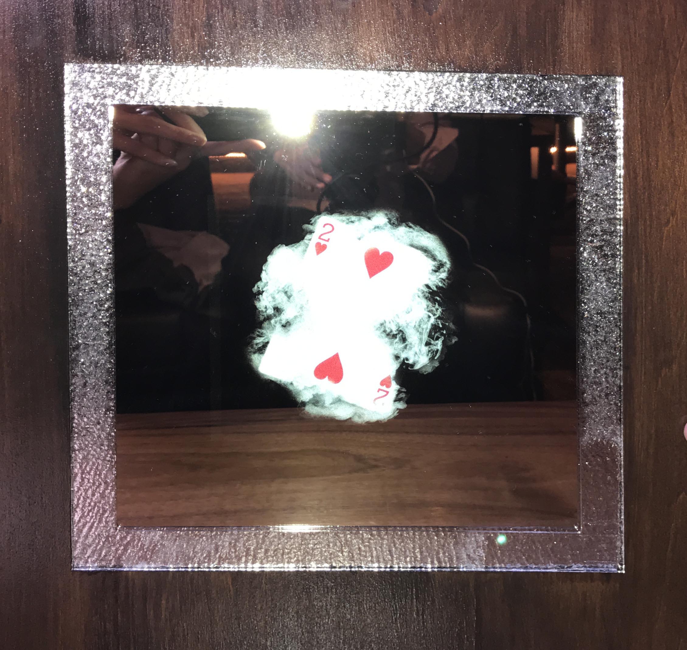観客は試しにフラッシュを焚いて鏡の写真を撮ってみます。ところがそこにはただの鏡が写るだけです。そこでイメージしやすいようにトランプを1枚選びます。そのマークと数字をしっかりと思い浮かべながらもう1度写真を撮ってみます。すると今度はイメージしたトランプが鏡の真ん中にぼんやり浮かび上がるのです。イメージが不安定なのかモヤの中に選んだカードが写っているのです。